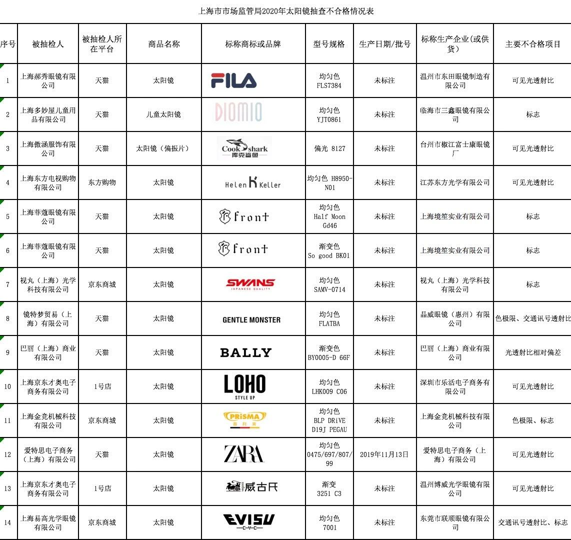 其中,由上海郝秀眼镜有限公司、温州市东田眼镜制造有限公司生产(或供货)的斐乐(FILA)太阳镜被检测出主要不合格项目为“可见光透射比”。由爱特思电子商务(上海)有限公司生产(或供货)ZARA被检测出未达到企业明示浅色太阳镜标准要求。