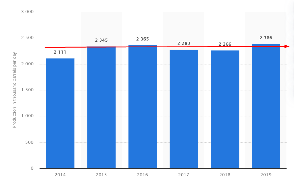 2014年—2019年埃克森美孚液体产量 (来自Statista 2020)