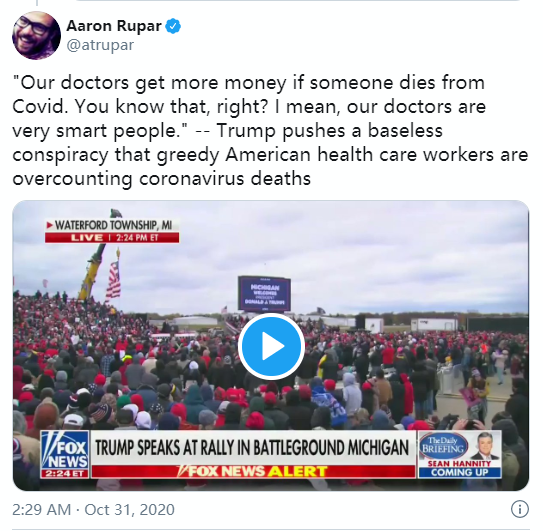 美国《名利场》(Vanity Fair)10月31日消息,美国总统特朗普当地时间周五(31日)在密歇根州竞选集会上表示,“如果有人死于新冠,我们的医生会得到更多的钱。”并给美国新冠死亡人数多找了个“新理由”:医护人员篡改新冠死亡数据。