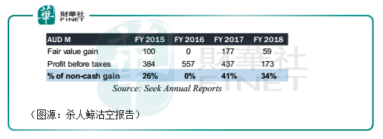 “财技”指控方面,Seek从2015财年至2018财年均有相当部分来自公允价值变动收益。以2018财年为例,当年公司因为投资的脉脉估值在半年之间从17年11月的2.5亿美元上升四倍至18年4月的10亿美元而录得公允价值变动收益5900万澳元。