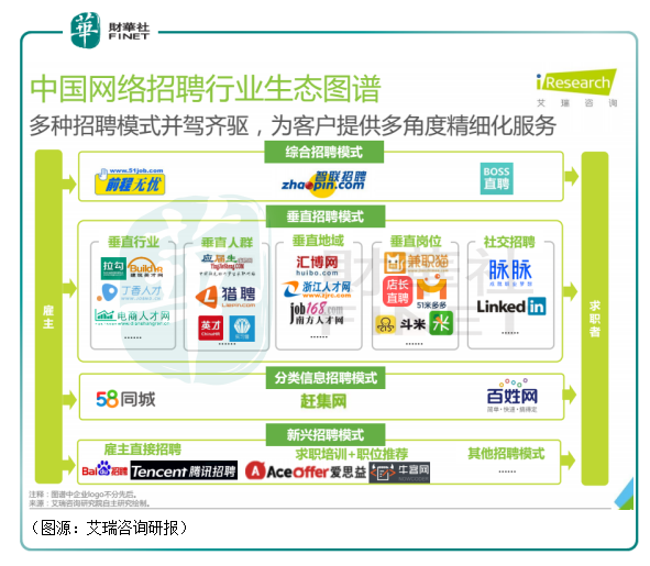 这还得从行业的格局说起。整体而言,互联网招聘的赛道已有些拥挤,综合招聘有前程无忧、智联招聘及BOSS直聘;垂直招聘模式按照行业、人群、地域、社交还可以细分成不同的模式,分类信息有已经“过气”的58同城及赶集网等。