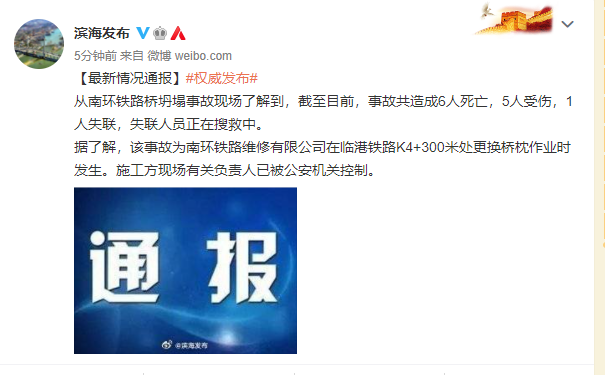 @滨海发布 微博11月1日通报,从南环铁路桥坍塌事故现场了解到,截至目前,事故共造成6人死亡,5人受伤,1人失联,失联人员正在搜救中。