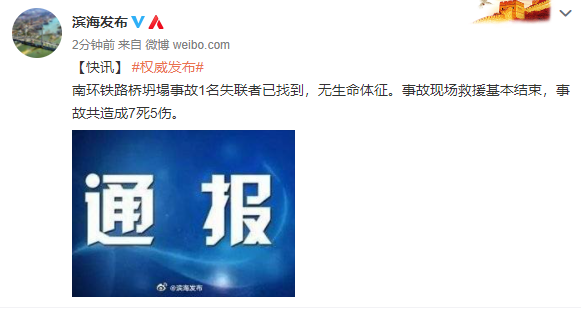 据@滨海发布 微博,南环铁路桥坍塌事故1名失联者已找到,无生命体征。事故现场救援基本结束,事故共造成7死5伤。
