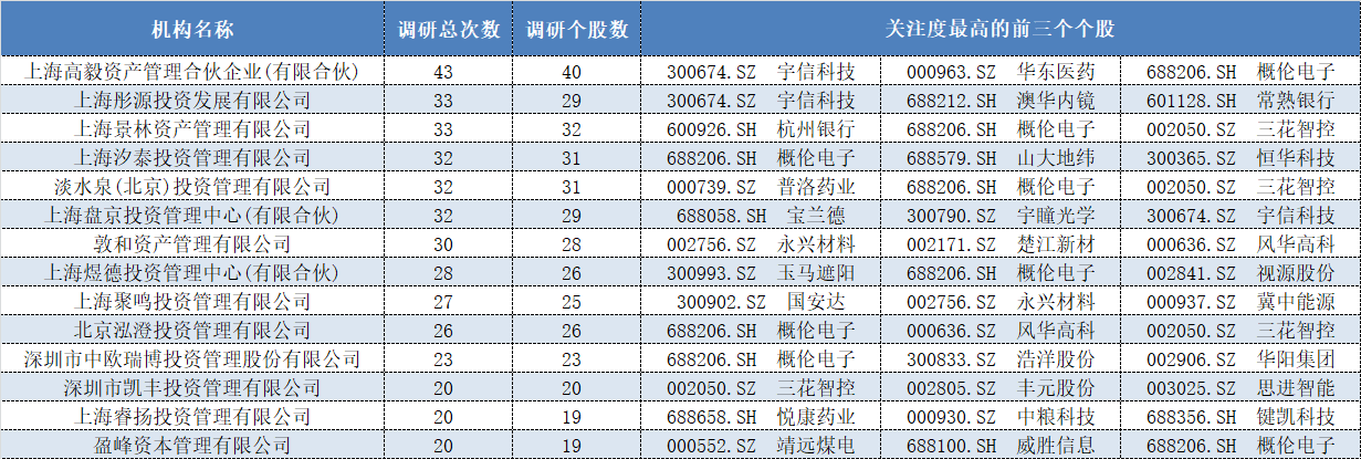 表格:1月调研次数不少于20次的14家百亿私募关注度前三个股情况