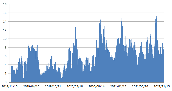 界面新闻进一步统计了近三年以来市场大面(指股票大跌)的变化情况,数据显示,近三年里大面数量的阶段性极值是不断创新高的,均值也处于不断拉升状态。其中,2018年-2019年,均值大概在4个左右,2020年-2021年平均值已经到7个左右,2021年9月大面数量更是创出了新高,已经接近16个。