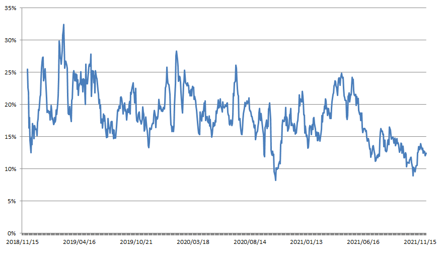 一般来说,1进2胜率的回归周期大致在1到3个月,但2021年下半年以来,其胜率一直在不断降低,从5月份下跌至今,依旧毫无回归迹象,最低胜率仅为8.94%左右。