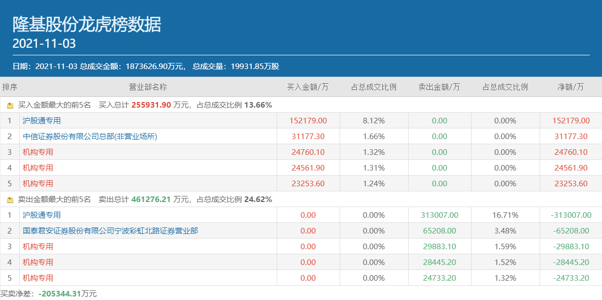 此外,从11月3日的龙虎榜数据来看,除了章盟主大举出逃以外,北上资金和机构资金对隆基股份的态度都出现了明显的分歧。