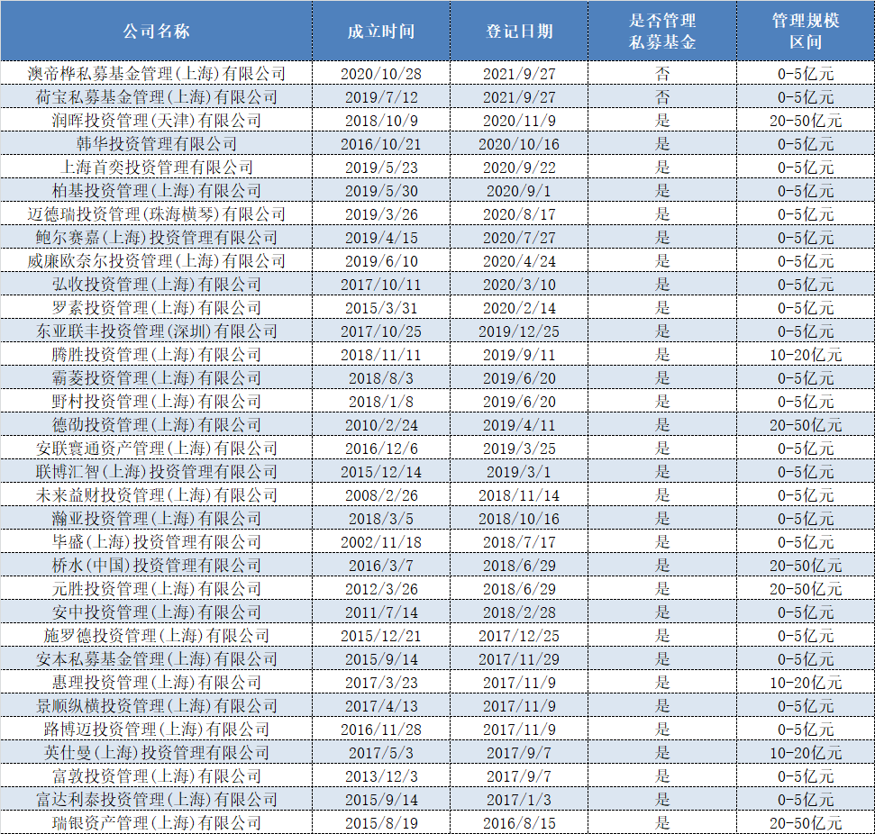 其余25家外资私募的管理规模均仅为0-5亿元,占比75.76%。其中,早在2017年已经完成备案的富达利泰投资、富敦投资、路博迈投资、景顺纵横投资、安本私募以及施罗德投资等目前的管理规模也都只有0-5亿元。