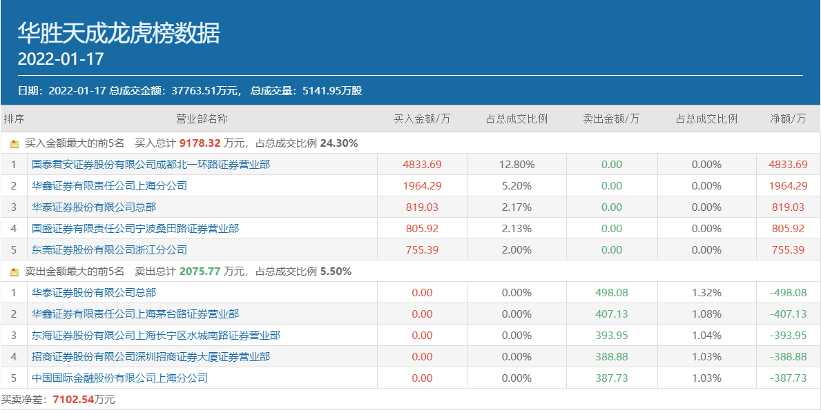 成都系游资则更青睐于主板个股华胜天成(600410.SH),其常用席位国泰君安证券成都北一环路以4833.69万元的买入额出现在该股买方榜首。另外,华鑫证券上海分公司也买入华胜天成1964.29万元,位列买方第二位;华泰证券总部和国盛证券宁波桑田路也分别买入该股800余万元。