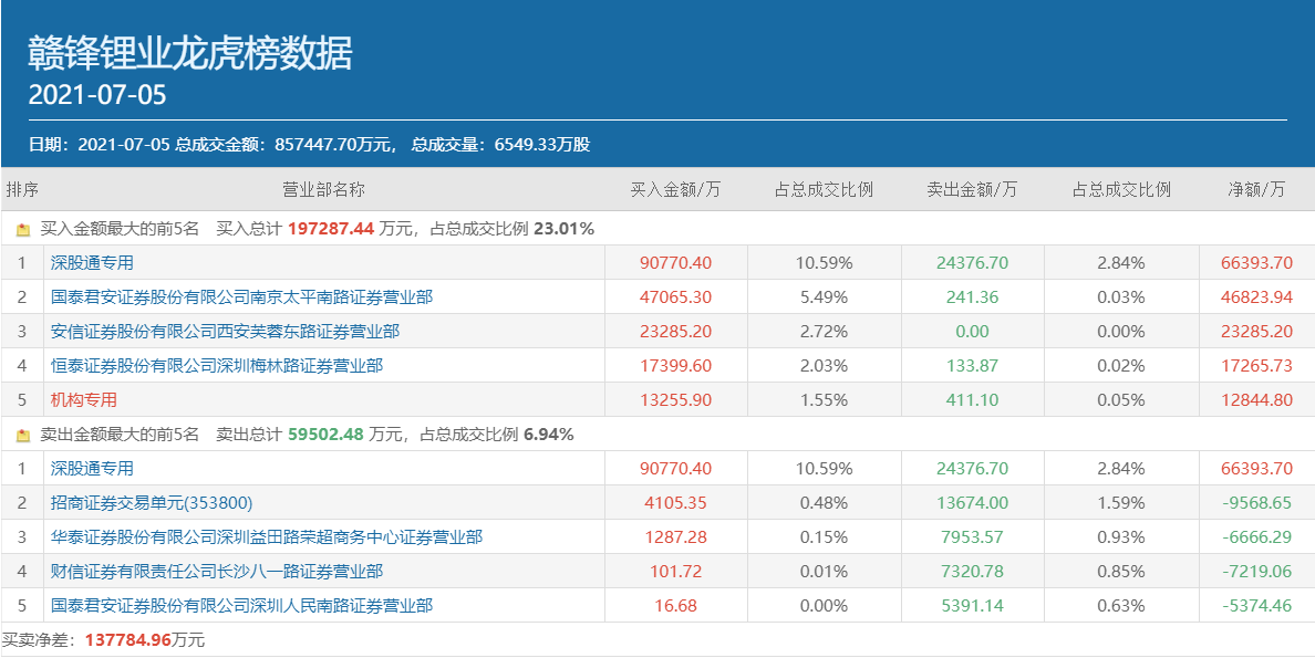 当日公布的龙虎榜数据显示,深股通专用席位同时居于赣锋锂业龙虎榜买卖双方榜首,净买入金额达6.64亿元;知名游资作手新一的常用席位国泰君安证券南京太平南路位列买方第二位,买入金额为4.71亿元;另有一个机构专用席位居于该股买方第五位,买入金额为1.33亿元。