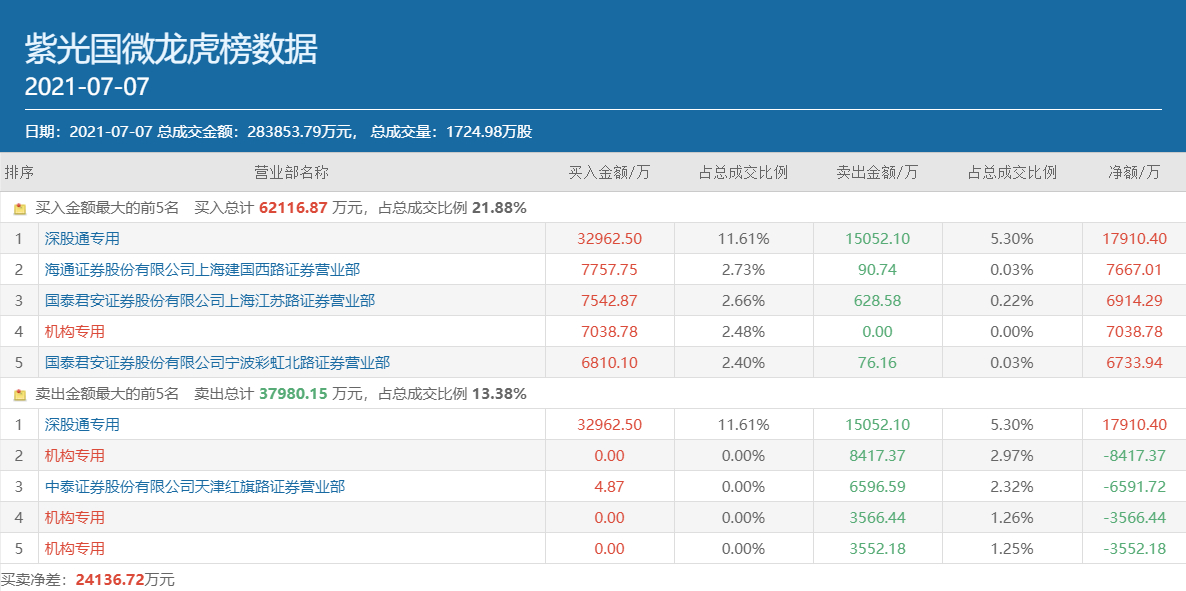 好在机构资金也并未一致看空,当日还有一个机构专用席位居于紫光国微龙虎榜买方第四位,买入金额为7038.78万元。与机构资金有着相似投资风格的北上资金当日也在净买入该股,深股通专用席位同时位列紫光国微龙虎榜买卖双方榜首,买入金额为3.3亿元,卖出金额为1.51亿元。