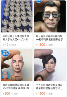 以比例1:6的的人脸模型为例,买家提供标准人脸正面照或正、侧面照片的话,收费为1000元;如果只提供生活照、自拍照,甚至是有美颜滤镜的照片作为模板,收费就要1500元。