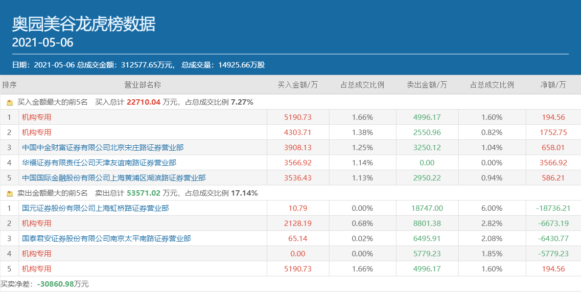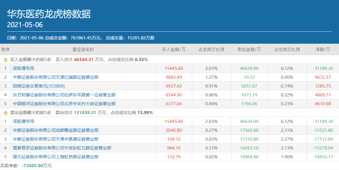 不过,值得注意的是,5月6日,知名游资常用席位华泰证券成都蜀金路也出现在华东医药卖方前五位,卖出金额为1.76亿元;深股通专用席位也以出货为主,买入1.54亿元,卖出4.66亿元。知名游资作手新一的常用席位国泰君安证券南京太平南路则在当天卖出奥园美谷6495.91万元,另有两个机构席位当日分别卖出该股8801.38万元和5779.23万元。
