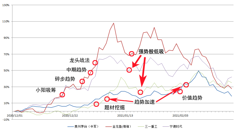 比如金龙鱼,早期随着股价不断上涨,对应了很多不同交易策略,底部的时候有小阳吸筹,随后是碎步趋势;然后是中期趋势,之后是龙头战法;冲高回落之后,还有强势股低吸等。三一重工则是挖掘核心资产时的题材挖掘,跟风金龙鱼,同时也趋势加速,是长期趋势。茅台是长期趋势,在年前最后五六个交易日,属于趋势加速。