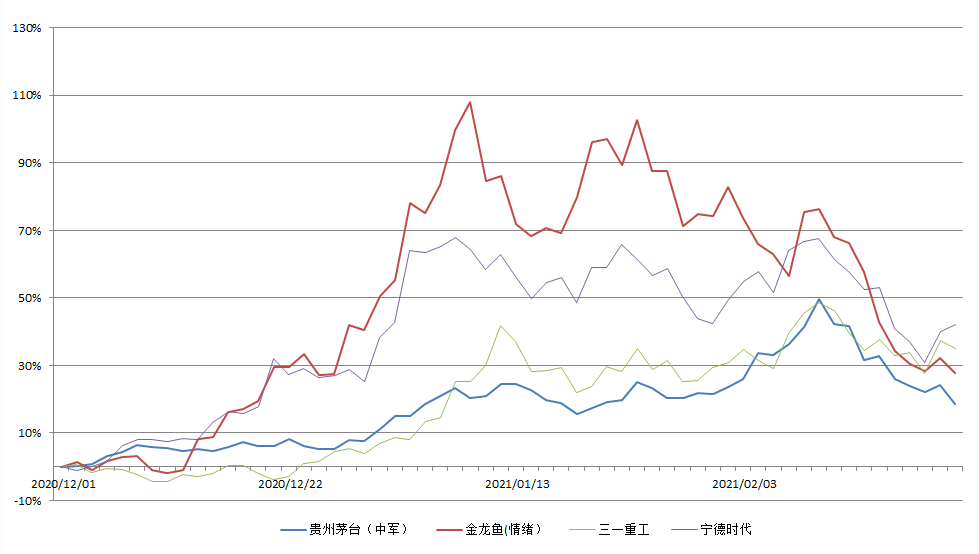 图:2020年12月以来几大核心资产标的股价走势与对应策略分布情况 数据来源:聚宽