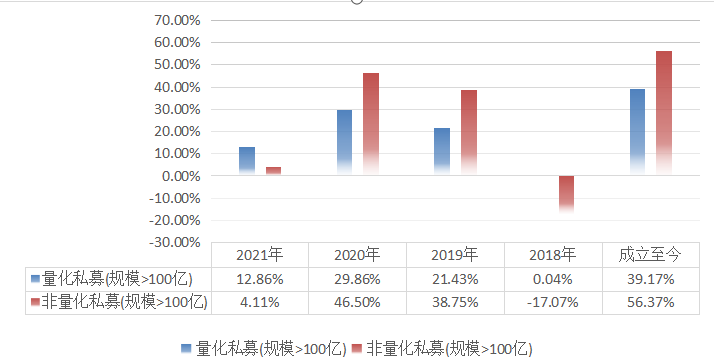 其中,在2020年和2019年,百亿私募机构的非量化私募产品以46.50%和38.75%的平均收益率表现优于量化私募的29.86%和21.43%;而2018年和2021年,量化私募产品平均收益分别为0.04%和12.86%,优于非量化私募产品的-17.07%和4.11%。