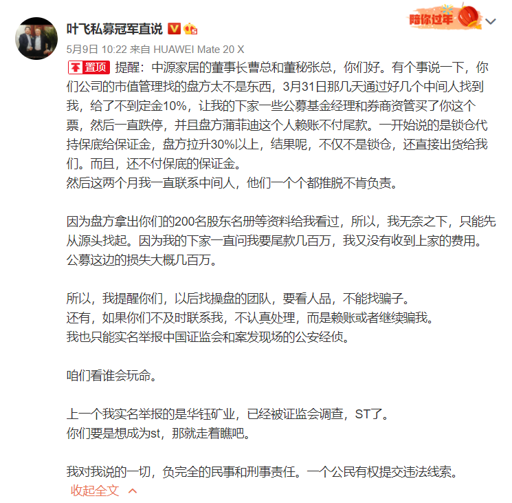 事件起始于叶飞在微博发文称,中源家居市值管理找的盘方赖账不付尾款,同时,上市公司股价下跌导致其下家的一些公募基金经理和券商资管出现了较大损失。“因为我的下家一直问我要尾款几百万,我又没有收到上家的费用。公募这边的损失大概几百万”。