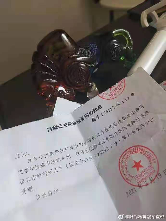 另外,叶飞还曾举报华钰矿业(601020.SH)总经理徐建华非法推荐股票和操纵市场,3月19日西藏证监局受理相关举报。