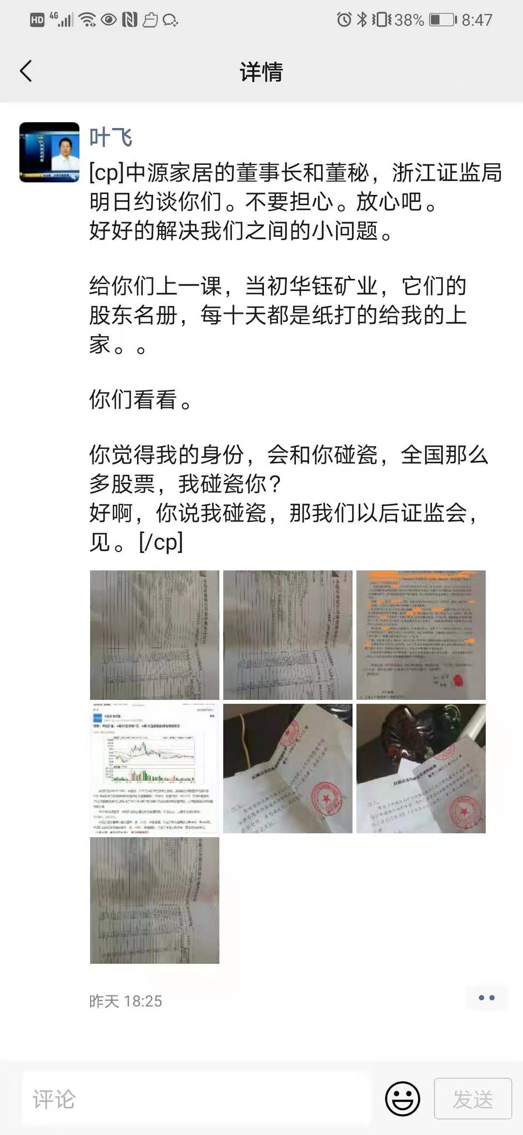 由此,叶飞此次爆料也被部分投资者解读为“碰瓷”。对此,叶飞在朋友圈喊话中源家居董事长和董秘:“你觉得我的身份,会和你碰瓷,全国那么多股票,我碰瓷你?”