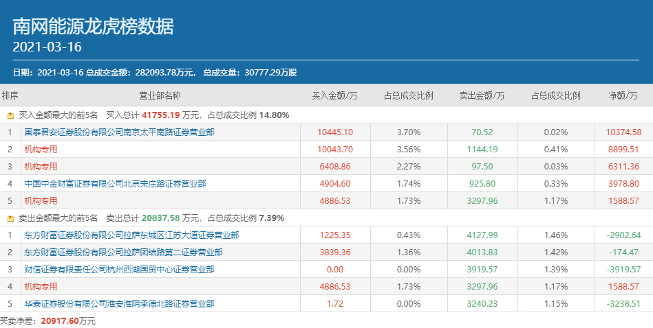 值得注意的,3月16日,与作手新一同时现身南网能源龙虎榜买方席位的还有3个是机构专用席位,分别占据了买二、买三和买五的位置,合计的买入金额为2.13亿元。