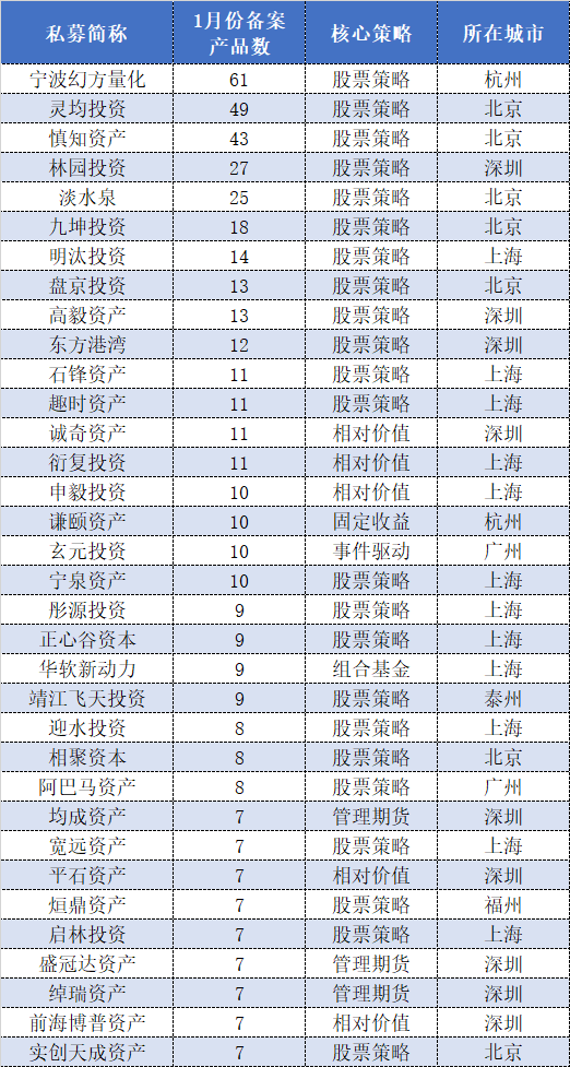 此外,以“逆向投资”著称的老牌百亿私募淡水泉投资也在今年1月份密集备案了25只新产品。盘京投资、高毅资产、东方港湾投资等亦在今年1月备案私募产品数量前十榜单中榜上有名。