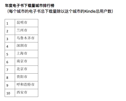 在“年度电子书下载量城市排行榜”上,昆明爆冷夺冠,二三名分别是兰州和乌鲁木齐。
