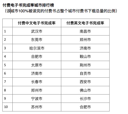 武汉斩获付费中文电子书阅读完成率榜首,其次是东莞和哈尔滨,南昌进口电子书阅读完成率高达97%,成为最爱英文阅读城市。