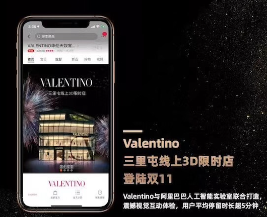 去年双11期间,Luxury Pavilion从首页延续到新品会场,与当日品牌尖货完美结合的烟火设计获得好评无数,高大上的设计契合奢品营销的气质同时,也带来沉浸式的体验。此外,平台还发挥技术优势,和阿里人工智能实验室Ai-lab帮助Valentino把北京三里屯的线下店3D复原到线上,消费者不仅可以在3D店铺各个楼层之间自由行走,还可以边逛边买,和店铺视频互动了解品牌信息与设计理念。