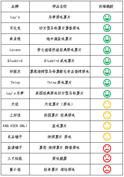 深圳市消费者委员会在10月29日发布的一份报告显示,在检测的15款国内外知名品牌薯片中,焙烤型薯片丙烯酰胺平均含量(3441μg/kg)高于油炸型薯片(547μg/kg)。有8款薯片样品低于欧盟设定的丙烯酰胺基准水平值(750μg/kg),包含中国产4款,进口4款。丙烯酰胺含量在750μg/kg-2000μg/kg之间的有天优、上好佳、RED ROCK DELI、良品铺子的薯片。丙烯酰胺含量最高、超过2000μg/kg的是盐津铺子、三只松鼠和董小姐的薯片。