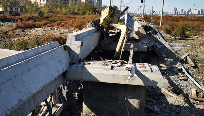 11月1日上午,维修公司万码车间在更换铁路桥枕线路中修作业时发生坍塌事故。更换桥枕的主要施工步骤为:拆除影响更换桥枕轨道连接设备、移出钢轨、挖掘机移出桥枕、人工配合挖掘机平碴、挖掘机放入新桥枕、安装钢轨及扣件、人工回填道砟并捣固、检查线路确认开通。坍塌事故发生时,正在进行桥上人工配合小型挖掘机平碴作业。该桥总长度32.54米(坍塌长度24米)、宽4米、厚度0.7米,桥梁悬空高度约3米,桥下为大沽排污河分支。
