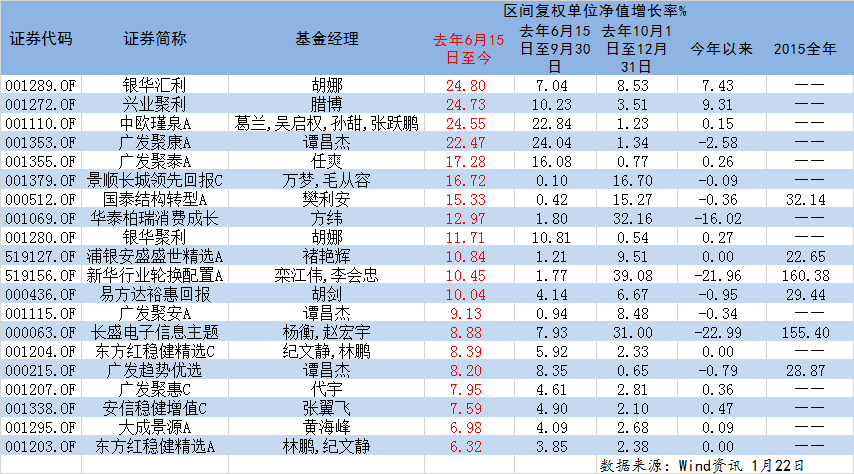 从去年6月中旬市场大调整算起,股市震荡已七月有余。哪些基金能够从中脱颖而出?根据Wind资讯数据统计,2015年6月15日至2016年1月22日期间,投资国内市场的权益类基金中,股票型基金“全军覆没”,尚未有收益“翻红”的产品出现。混合型基金中,则有199只获得正收益,最高收益达24.8%。下表为收益居前20的基金榜单: