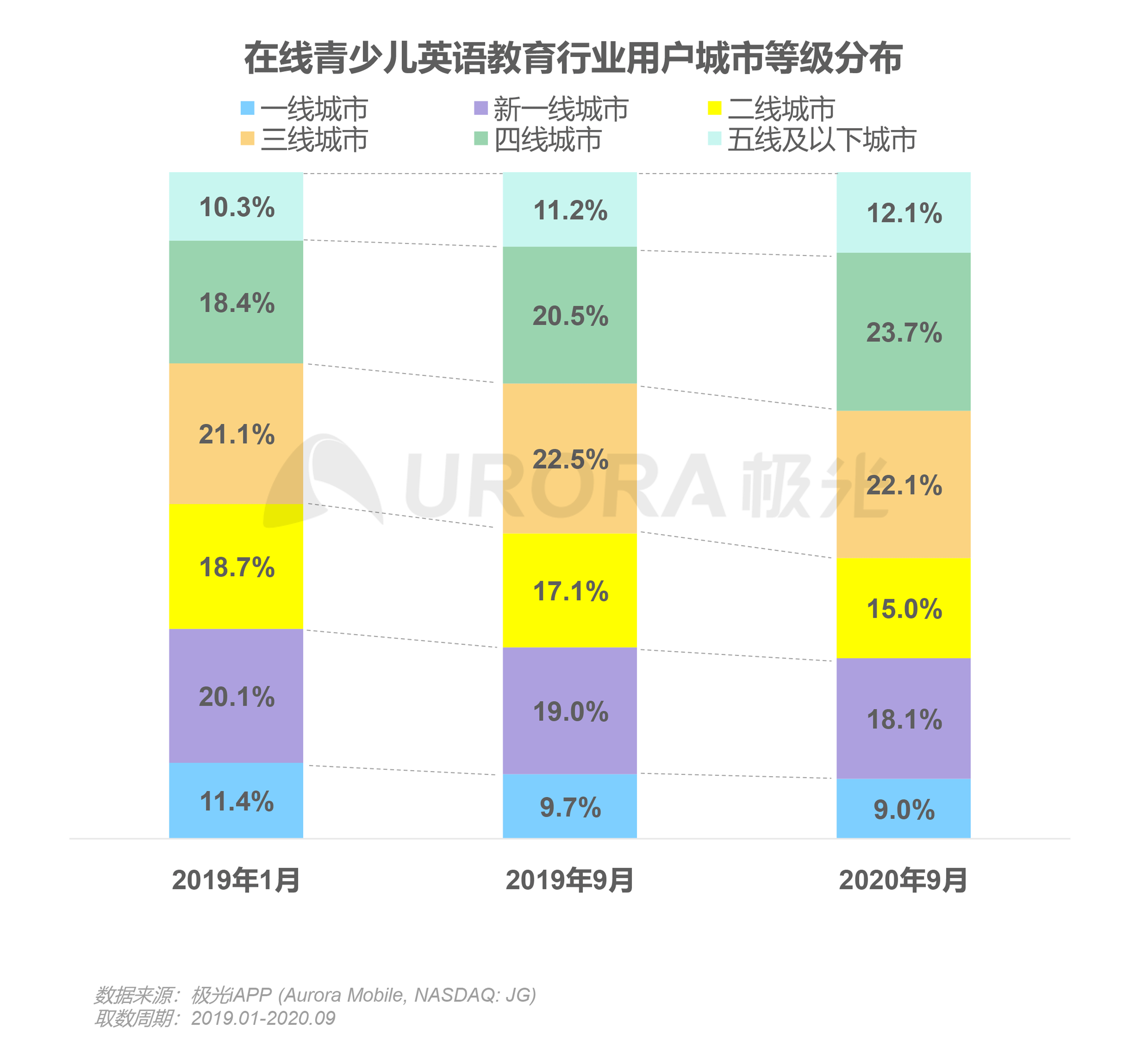 在线青少儿英语教育行业的下沉趋势明显,非一线城市英语学习用户的需求逐步释放,还有提升潜力。根据极光iAPP的数据显示,2020年9月三线及以下城市的占比增长了8.1个百分点(对比2019年1月),其中,四线城市增长最为显著,从18.4%至23.7%,增长5.3个百分点。