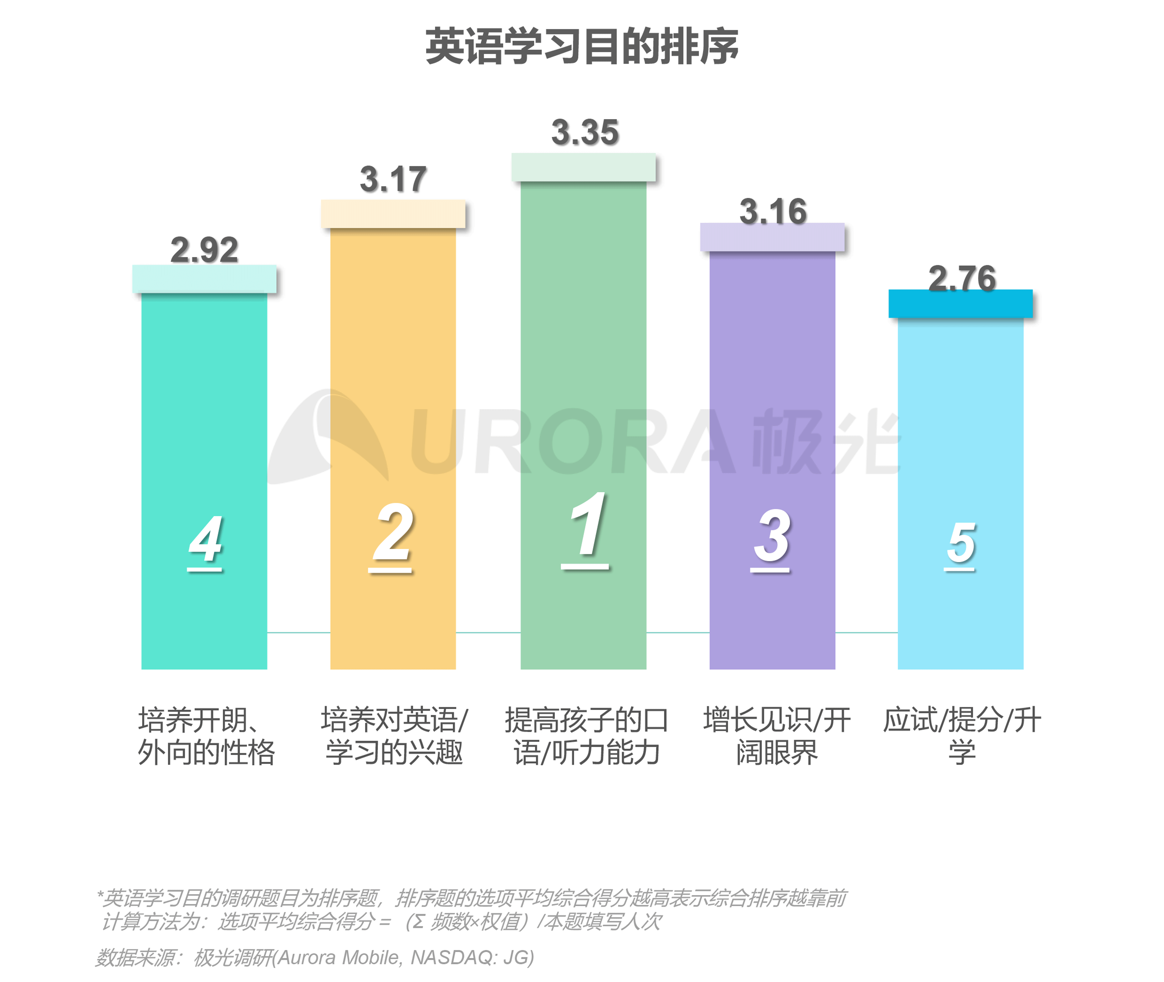 根据极光调研发现,对学习效果的评价中,用户对提高孩子的英语表达能力、考试成绩、学习兴趣三方面感知相对强烈。