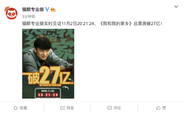 据“猫眼专业版”微博消息,截至11月2日20:21:24,《我和我的家乡》总票房破27亿元。