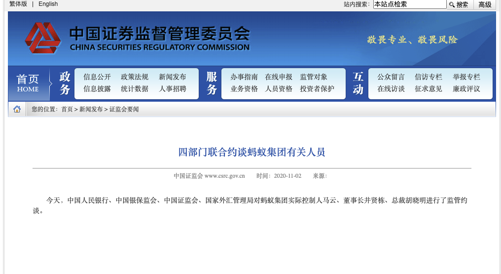 证监会官网2日消息,今天,中国人民银行、中国银保监会、中国证监会、国家外汇管理局对蚂蚁集团实际控制人马云、董事长井贤栋、总裁胡晓明进行了监管约谈。