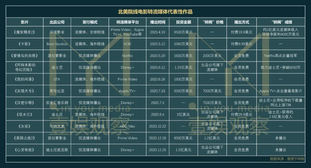 据《洛杉矶时报》统计,6月初“转网”流媒体仅10部左右,而到了10月下旬,这个数字已经上升到30部左右,其中仅派拉蒙一家公司,在半年内就出售包括《灰猎犬号》《芝加哥七君子审判》等6部院线电影给流媒体平台。