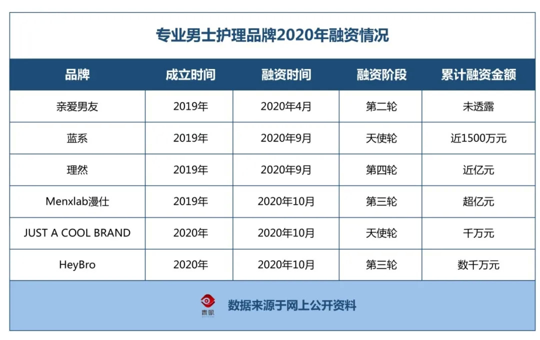 看起来,国内男士护理市场依旧被外资品牌牢牢占据,但事实上,与往年相比,这一品类今年异常热闹,尤其是在资本市场。据青眼不完全统计,截止目前,今年已有6个男士护理品牌获得了融资,分别是亲爱男友、蓝系、理然、Menxlab漫仕、JUST A COOL BRAND、HeyBro。它们成立的时间都很短,但大多已经获得了好几轮融资。其中理然更是在8个月的时间里,完成了4轮融资,累计融资金额近亿元。可见资本市场已经把男士护理市场,当做彩妆之后的又一个主战场。