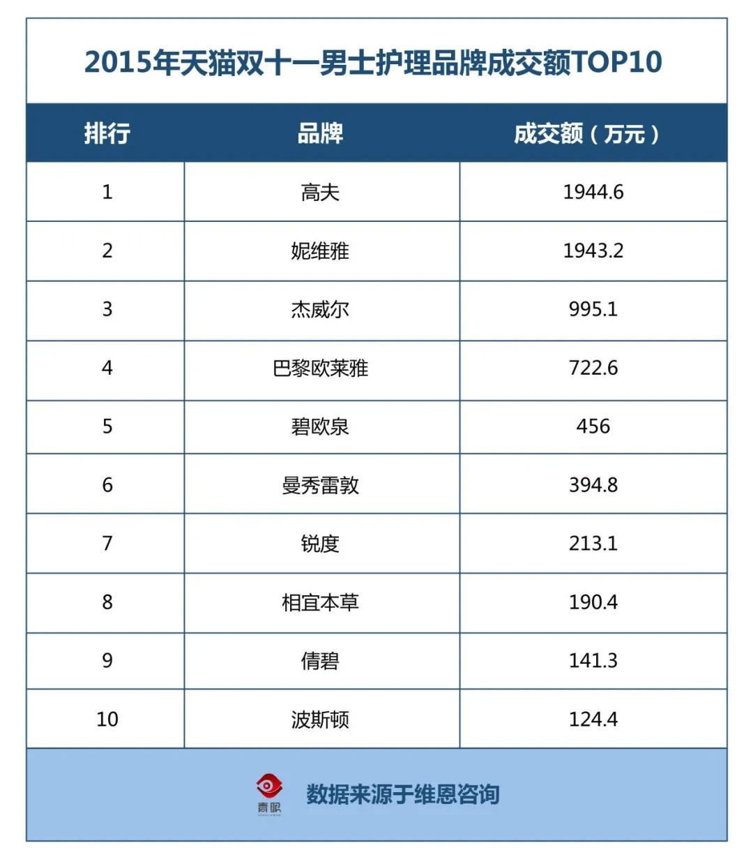 据2015年的天猫双十一数据显示,杰威尔的销售排名已经落到了第三位,并且销售额要远低于高夫和妮维雅。另外在销售排名前十的品牌中,也只有杰威尔、锐度、波斯顿三个国产男士护理品牌。