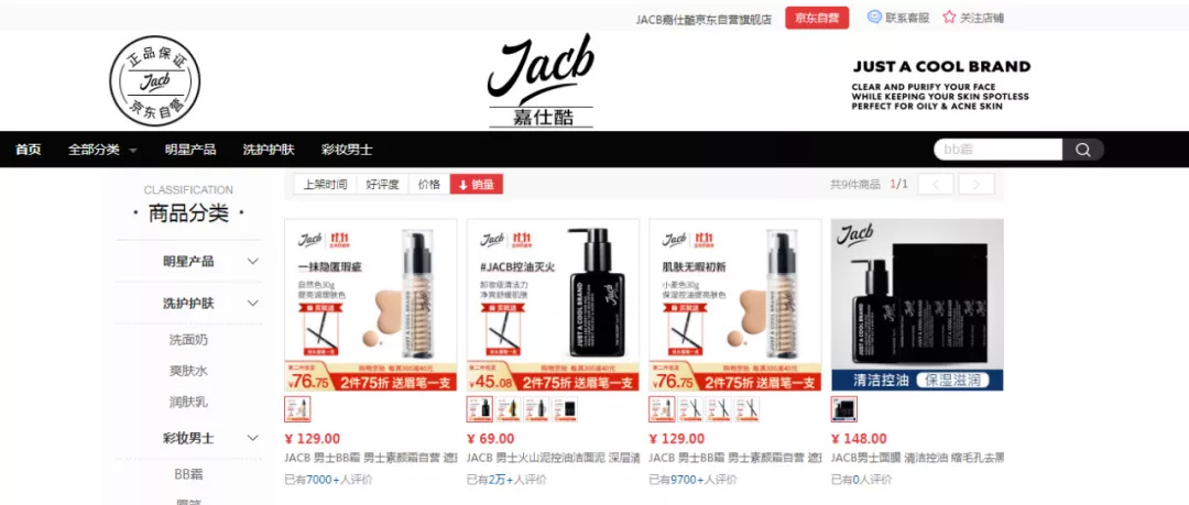 此外,Menxlab漫仕和JUST A COOL BRAND目前还未入驻天猫。根据京东数据显示,Menxlab漫仕销量最高的是一款售价149元的防脱洗发水,目前为止仅有70+的累计评价;而JUST A COOL BRAND销量最高的是一款男士BB霜,价格129元,累计评价有7000+。