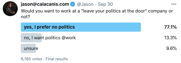 Calacanis甚至还发起投票,有6185位参加“你会想在无政治文化的企业工作吗?”的投票: