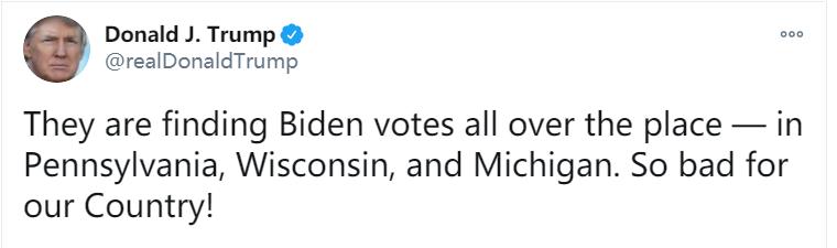 眼看获胜几率愈发渺茫,特朗普决定削弱大选结果的可信度。在周三和周四的一系列推特中,他指控大选存在欺诈等不当行为,坚称对于所有拜登依靠后期邮寄选票反超的州,特朗普团队都要采取法律行动。但除了要求共和党观察员与处理选票的工作人员距离更近外,特朗普团队的诉求都难以被满足,各州法官认为并无暂停或重新计票的基础。