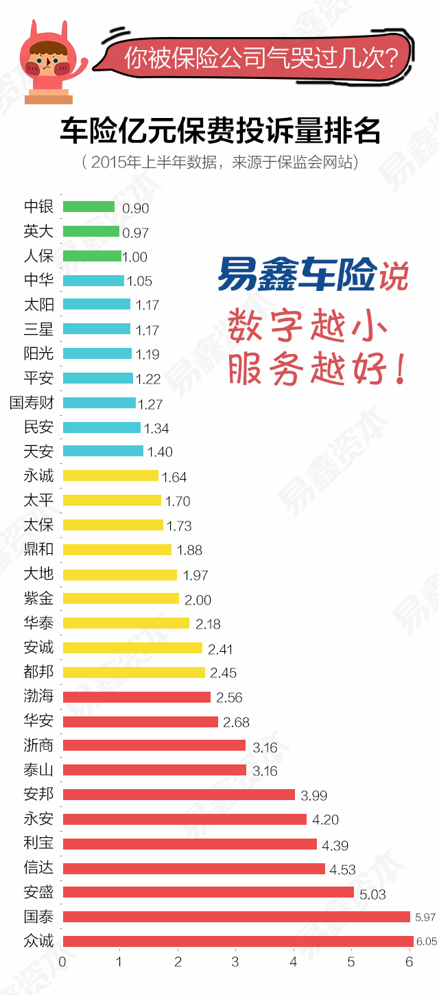 在这里,易鑫车险建议精明的车主:只看百分比,别看总投诉量;因为很多媒体喜欢看哪家公司投诉量最大!要知道,最大的保险公司一年4000多万车主投保,最小的就十几万车主投保,规模能比吗?