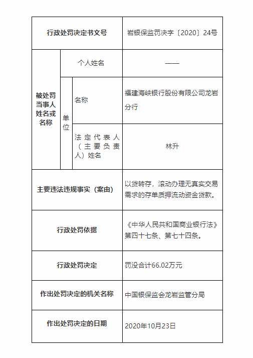 11月3日消息,据银保监会龙岩分局行政处罚信息公开表,福建海峡银行股份有限公司龙岩分行,因“以贷转存,滚动办理无真实交易需求的存单质押流动资金贷款”罚没合计66.02万元。