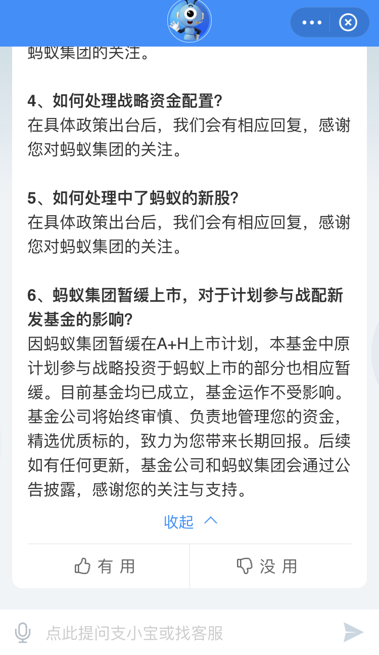 11月4日消息,针对蚂蚁集团暂缓上市对于计划参与战配新发基金的影响,支付宝客服就相关问题答复称,因蚂蚁集团暂缓在A+H上市计划,本基金中原计划参与战略投资于蚂蚁上市的部分也相应暂缓。目前基金均已成立,基金运作不受影响。