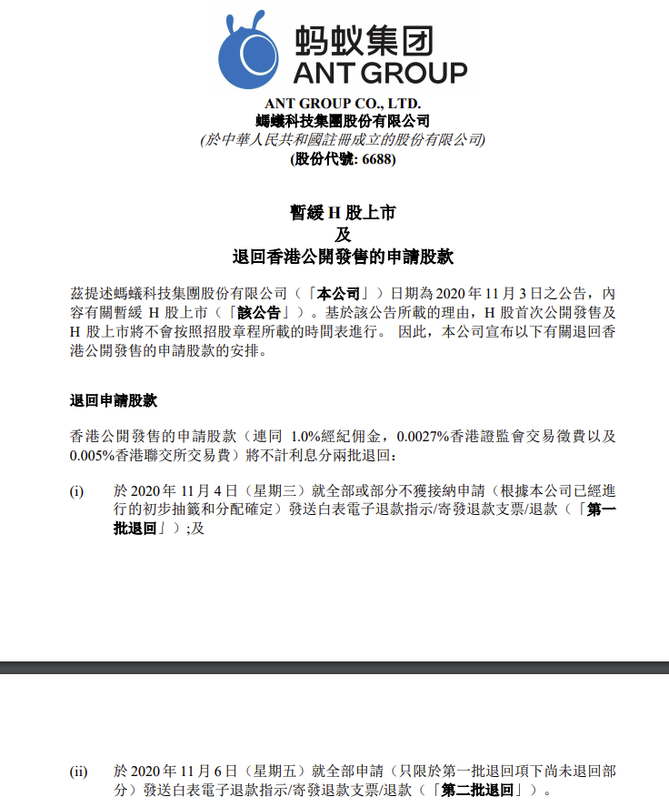 蚂蚁集团在港交所发布公告称,兹提述蚂蚁科技集团股份有限公司日期为2020年11月3日之公告,内容有关暂缓H股上市。基于该公告所载的理由,H股首次公开发售及H股上市将不会按照招股章程所载的时间表进行。因此,本公司宣布以下有关退回香港公开发售的申请股款的安排。香港公开发售的申请股款(连同 1.0%经纪佣金,0.0027%香港证监会交易徵费以及 0.005%香港联交所交易费)将不计利息分两批退回。