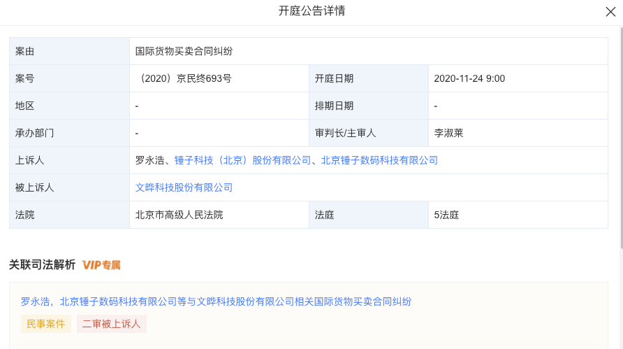 据天眼查APP显示,近日,文晔科技股份有限公司新增二审开庭公告,案由为国际货物买卖合同纠纷,案号为(2020)京民终693号,开庭时间为11月24日。二审上诉人为北京锤子数码科技有限公司、锤子科技(北京)股份有限公司、罗永浩,二审被上诉人为文晔科技股份有限公司。
