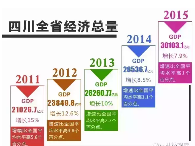 近日,四川省统计局发布,2015年四川省实现地区生产总值(GDP)30103.1亿元,按可比价格计算比上年增长7.9%。正式进入GDP3万亿俱乐部,也成为西部首个经济总量站上3万亿台阶的省份。其中,第一产业增加值3677.3亿元,增长3.7%;第二产业增加值14293.2亿元,增长7.8%;第三产业增加值12132.6亿元,增长9.4%。