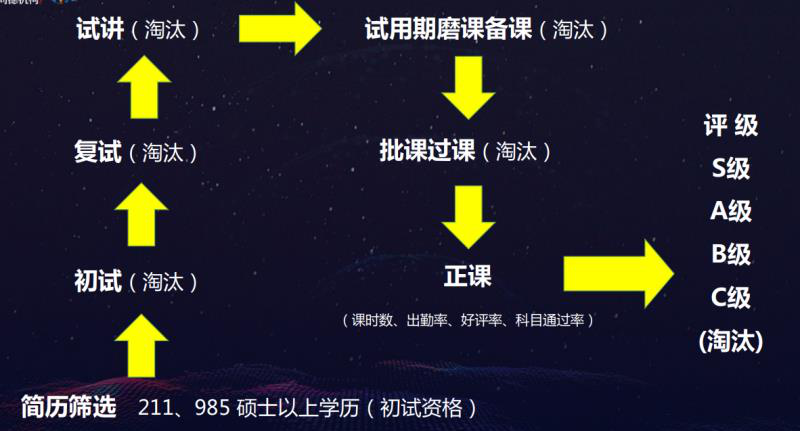 此外,班主任发布在群里的师资筛选流程显示,教师的初试资格为211、985硕士以上学历,“让这群最会考试的人教你怎么学习。”