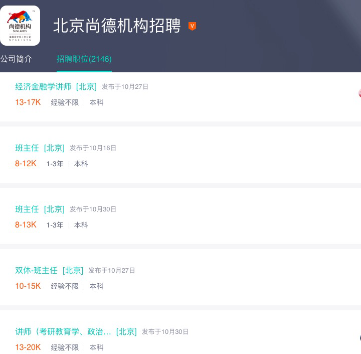 但锌刻度通过招聘平台找到了尚德机构的招聘要求,发现上千条招聘信息中,招聘的职位多为负责运营和销售的职位,且无论是金融学讲师、考研心理学讲师、公考讲师等讲师职位,还是班主任、运营班主任等辅导咨询职位,都并未对硕士学历和教师资格证作出要求。