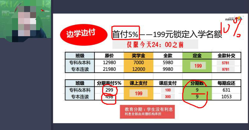 班主任迅速接话答,“可以哦,今天办理入学,单专单本299就能办理入学。”并很快将话题转至经济困难的可以贷款,“分期可全程免息”。